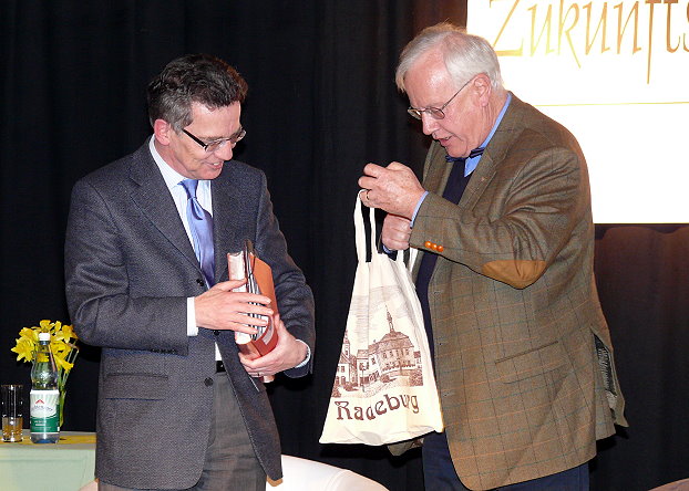 Zuhörer im Kulturbahnhof Radeburg v.l.n.r. Dr. Thomas de Maizière, Herr Dingler Vorsitzender des Gewerbevereins, Dr. Matthias Rößler MdL Herr Dingler Vorsitzender des Gewerbevereins übergibt regionale Präsente zum Dank |