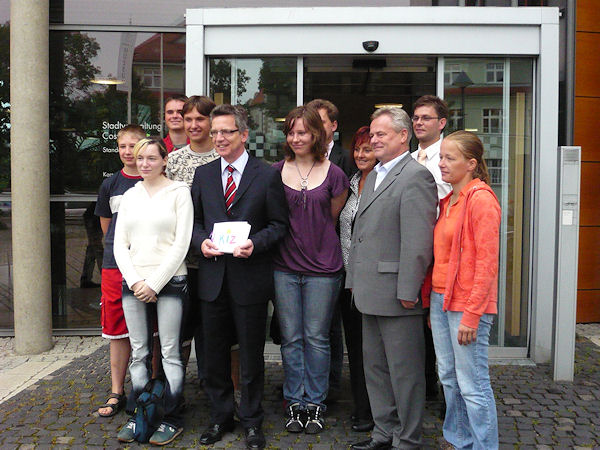 | Im Rathaus empfing Oberbürgermeister Neupold den Bundesminister, der zu einer Gesprächsrunde mit Jugendlichen gekommen war und sich über die Projektarbeit und das Ferienprogramm des KIZ Coswig e. V. informierte. Mit Begeisterung erzählten die Jugendlichen von Ihrem KIZ und Thomas de Maizière zeigte sich beeindruckt vom vielfältigen Freizeitangebot, dass vom arriba - Tanzkeller bis zu den Schulclubs in der Mittelschule Kötitz und "Leonhard Frank" reicht. |