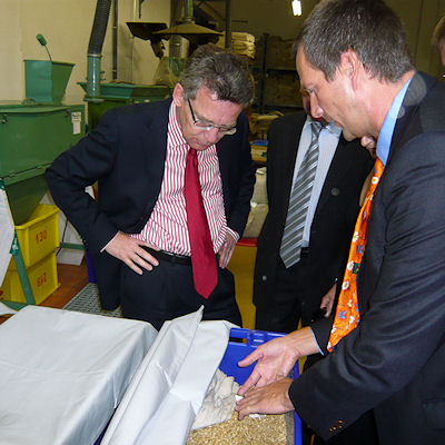 Herr Haubold erklärt eine Saatmaschine Dr.Vaupel zeigt die ungereinigte Saatgutpartie der Wintergerste |