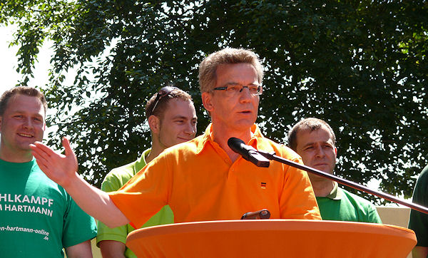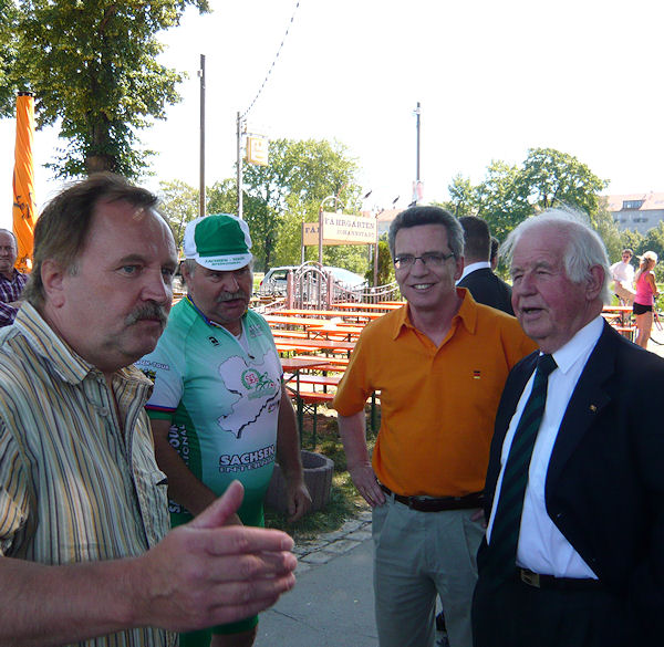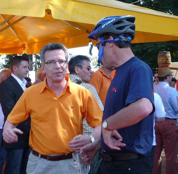 | Bei herrlichstem Sommerwetter hatte die CDU mit Ministerpräsident und Spitzenkandidat Stanislaw Tillich zu einer Familiensternfahrt auf die Dresdner Elbwiesen eingeladen. Auch Thomas de Maizière kam mit dem Fahrrad. In seinem Grußwort wünschte er der CDU Sachsen ein gutes Abschneiden als Vorlage für die Bundestagswahl am 27.September. Bei Faßbieranstich und deftiger Suppe aus der Gulaschkanone war Gelegenheit zu lockerem Gespräch und persönlichem Kennenlernen. |