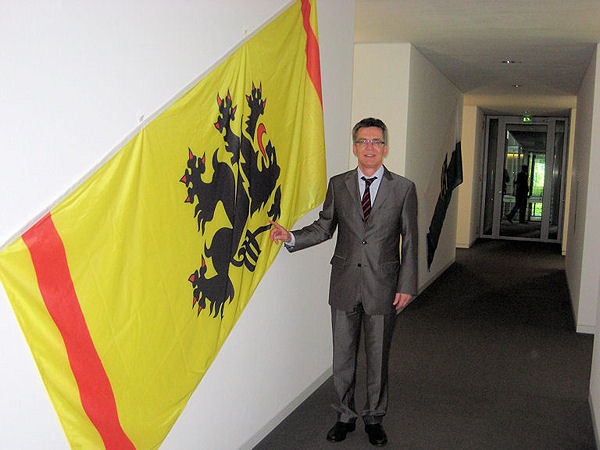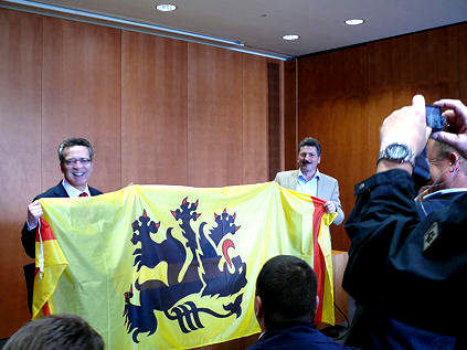 Berlinbesuch Beim Besuch von Landrat Arndt Steinbach mit Feuerwehrleuten, Polizei und Rettungsdiensten im Bundestag wurde de Maizière eine Fahne des Meißner Landkreises überreicht. Eine sichtlich freudige Überraschung. Jetzt hängt sie im Flur der Sächsischen Abgeordneten im Bundestag im Paul-Löbe- Haus gleich neben dem Eingang zu seinem Büro und ziert die bis dato kahlen Wände. Andere Abgeordnete fanden die Idee so gut, dass sie mit eigenen regionalen Flaggen nach zogen. |