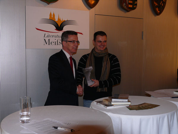 Ich freue mich, in diesem Jahr wiederum die Schirmherrschaft für das Literaturfest Meißen übernehmen zu dürfen. Das Lesen als Teil des Alltags zu präsentieren und zu fördern ist ein Anliegen, das ich gern unterstütze. In Zeiten, in denen in vielen Haushalten Fernseher und PC dominieren ist es wichtig, insbesondere Kindern und Jugendlichen Lese-Erfahrungen zu ermöglichen, die sie für das Lesen begeistern. Das Literaturfest mit seinen vielfältigen Veranstaltungen und prominenten Vorlesern bietet dazu eine gute Gelegenheit. de Maiziere und Frank Goldammer mit seinem neusten Buch werben für das Literaturfest Ich kann mir kaum einen stimmungsvolleren Ort für das Vortragen mittelalterlicher Literatur, historischer Romane und Fantasy vorstellen als die Plätze, Gassen und Höfe Meißens. Diese Orte der Geschichte verwandeln sich in Schauplätze von Geschichten und lassen das Gelesene vor historischer Kulisse lebendig werden. Veranstaltungen dieser Art braucht die Stadt. Durch das Literaturfest Meißen wird die gesamte Region auch überregional als Kulturlandschaft wahrgenommen. Das Thema des diesjährigen Literaturfestes "Kunst und Genuss" läßt stadtgeschichtliche Jubiläen wie "300 Jahre Meißner Porzellan" und "550 Jahre Schwerter-Bräu" über die Grenzen unseres Freistaats hinaus Beachtung finden. Ich glaube, dass sich das Fest in den nächsten Jahren zu einem kulturellen Magnet im Freistaat Sachsen entwickeln kann und fester Bestandteil der Kultur in der Region wird." |