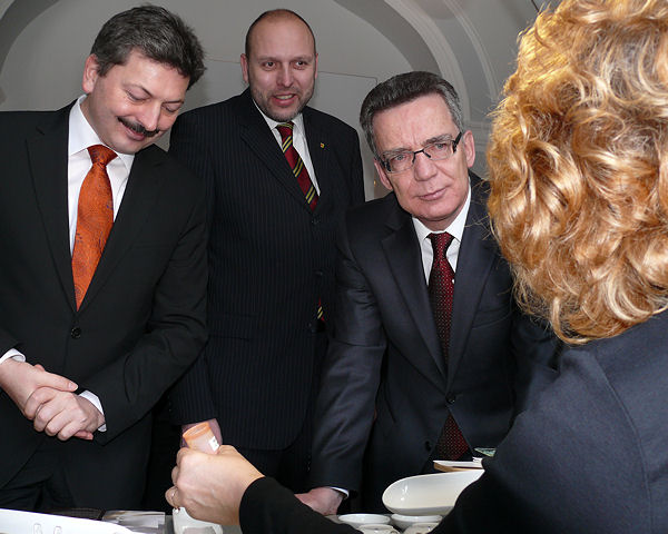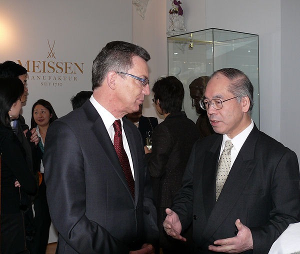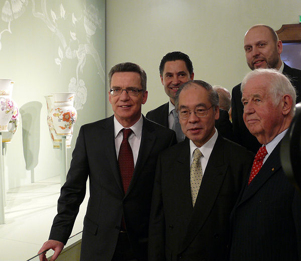 Beobachten der geschickten Arbeit einer Porzellanmalerin v.l.n.r. Landrat A. Steinbach, OB O. Raschke, BM Dr. Th. de Maizière Im Gespräch mit dem japanischen Botschafter Herr Dr. Takahiro Shinyo Grußwort zur Eröffnung der Ausstellung v.l.n.r. de Maizière, Dr. Christian Kurtzke, Dr. Takahiro Shinyo, OB Raschke, MP a.D. Kurt Biedenkopf - |
