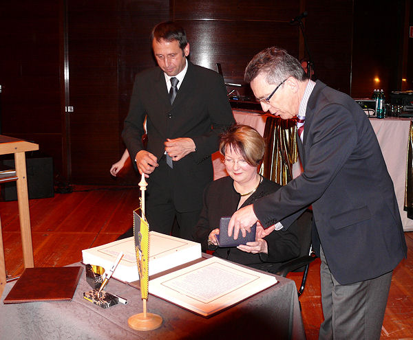 Verleihung der Kleinen Preuskermedaille an Frau Margit Werner v.l.n.r. OB Burkhard Müller, Margit Werner, de Maizière |