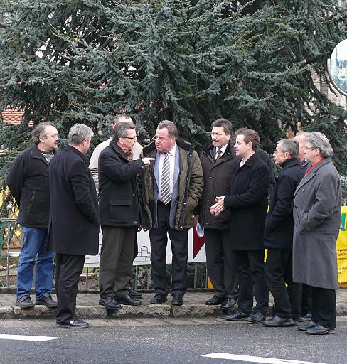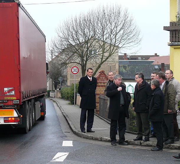 | Die Bürgermeister von Schönfeld, Lampertswalde und Thiendorf hatten Dr. Thomas de Maizière zu einem Vororttermin eingeladen, um den frisch nominierten CDU Bundestagskandidaten auf die Probleme mit der Ortsumfahrung B 98 aufmerksam zu machen. Es ist nicht die erste Runde zu diesem Thema, das die Bürgermeister, Abgeordneten Gemeinderäte und natürlich die Anwohner schon über Jahre beschäftigt. Hunderte von LKWs rollen auf kurvenreicher Strecke durch den kleinen Ort. Dr. Thomas de Maizière hört zu, geht auch mit direkt an die Straße, wo große LKWs vorbei donnern und man sein eigenes Wort nicht mehr versteht. Aber er ist nicht gekommen mit großen Versprechungen oder dem Baustart in der Tasche. Er ist Realist und weiß, dass es hier am Planungsvorlauf liegt, wenn man wie anderswo in Sachsen und im Landkreis Meißen nicht vom Konjunkturpaket profitieren kann. |