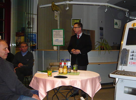 | "Eigentlich hat Großenhain ja seine Hausaufgaben in punkto öffentlicher Personennahverkehr gemacht, aber es gibt nichts was nicht noch besser gemacht werden könnte", so leitet Tilo Hönicke die Diskussionsveranstaltung ein. Vom gelungenen Bahnhofsumbau und dessen Nutzung können sich die Teilnehmer selbst überzeugen, da die Veranstaltung im Bistro Faustus des Cottbuser Bahnhofs statt findet. Man sitzt an den Bistro -Tischen, die sonst die Reisenden nutzen und die Einführungsreferate halten der Landrat Arndt Steinbach sowie Burkhard Ehlen, Geschäftsführer des Verkehrsverbunds Oberelbe (VVO), gleich neben dem Fahrkarten Terminal. Die Übergangstelle Bus - Bahn ist modern und funktional, die Verbindung nach Dresden hat fast S-Bahn - Niveau und im neuen Landkreis Meißen wird es nur noch eine Verkehrsgesellschaft geben, die sich aus beiden Alten neu strukturiert. Aus dem Publikum verwies man auf die unzureichende Anbindung des Ortsteils Großraschütz durch den Stadtverkehr und auch der Schülerverkehr zur Kupferberg- Schule ist am Nachmittag schlechter. So entstehen für die Schüler Wartezeiten von mehr als einer Stunde. Auch die Zug - Verbindung nach Berlin hat sich verlängert,so braucht man jetzt ca. 3,5 Stunden. Die Verbindung Großenhain - Berlin ist auch für Bundesminister Dr. Thomas de Maizière ein aktuelles Thema, weil mit Blick auf die wichtige europäische Nord-Süd-Trasse in den nächsten Jahren entschieden wird, ob die Verbindung von Skandinavien bis zum Balkan über Großenhain- Dresden oder Krakau führt. Natürlich hat Deutschland ein großes Interesse an dieser transeuropäischen Verbindung, weil gute Verkehrsadern einen starken Impuls für die wirtschaftliche Entwicklung ganzer Regionen bringen. |