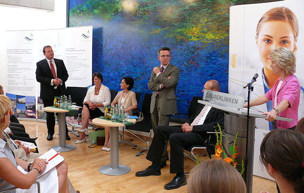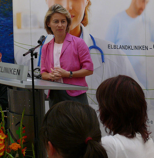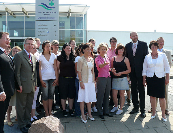 | Die Elblandkliniken und die Kompetenzagentur waren Stationen, die Ministerin von der Leyen auf Einladung von Thomas de Maizière am 25. August 2009 besuchte. In den Elblandkliniken diskutierten die Minister mit Mitarbeiterinnen und Mitarbeitern über die Umsetzung der neuen Familienpolitik. Der Geschäftsführer Herr Markus H. Funk stellte das Konzept für die geplante Betriebskita vor. Sie soll 2010 eingeweiht werden und bietet Kinderbetreuung, abgestimmt auf die Bedürfnisse von Schicht- und Wochenenddienst. |