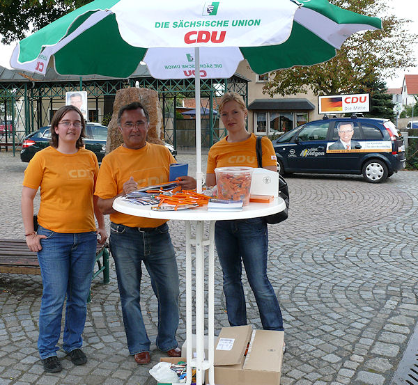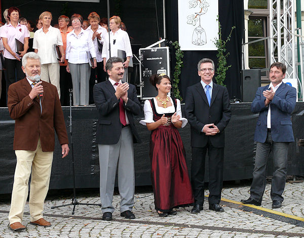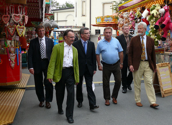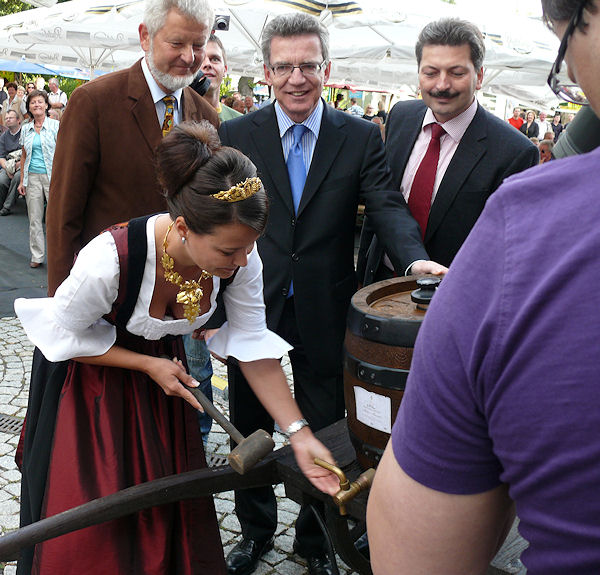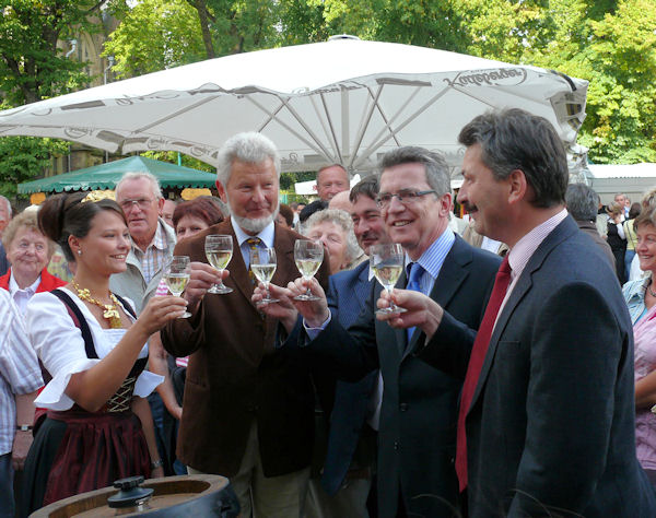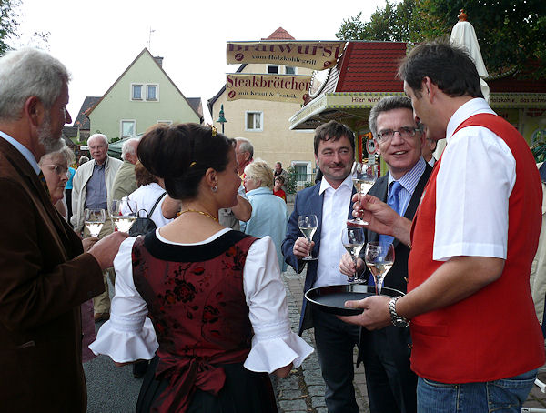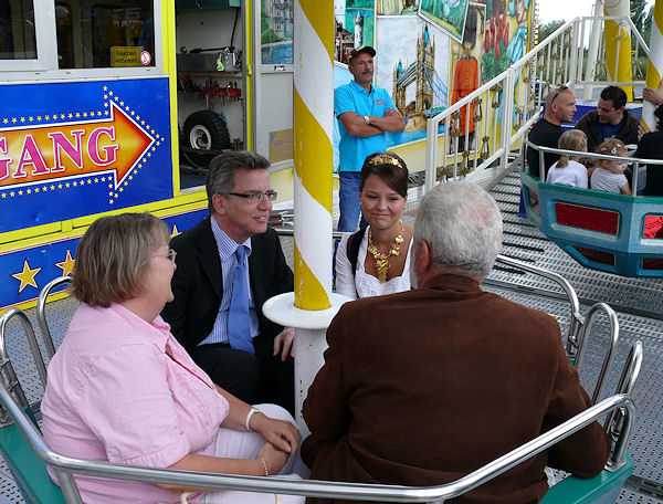 | Am Nachmittag gab es einen Infostand zur Bundestagswahl auf dem Rathausmarkt. Von dort aus begleitete der Bürgermeister Franke Thomas de Maizière zum Weinfest, dass er gemeinsam mit dem Landrat und der Weinkönigin, übrigens einer Weinböhlaerin, mit einem Grußwort eröffnete. Danach besuchte er die verschiedenen Weinstände und fuhr auch mit dem Riesenrad. |
